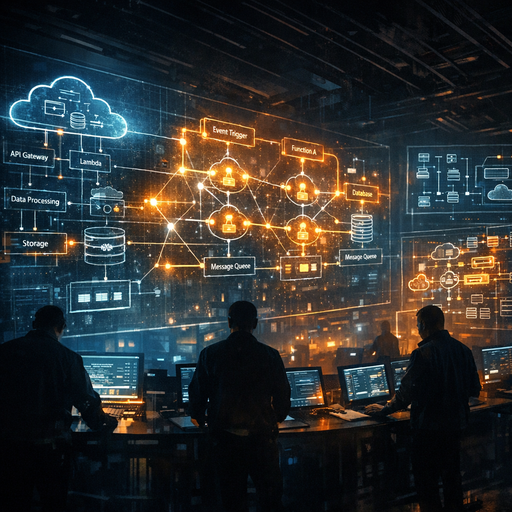 A dimly lit, futuristic cloud control room filled with transparent holographic diagrams of distributed systems and serverless workflows, glowing nodes connected by flowing lines of light, a few silhouetted engineers standing at consoles, cool blue and amber lighting, wide cinematic angle, high contrast, sharp detail