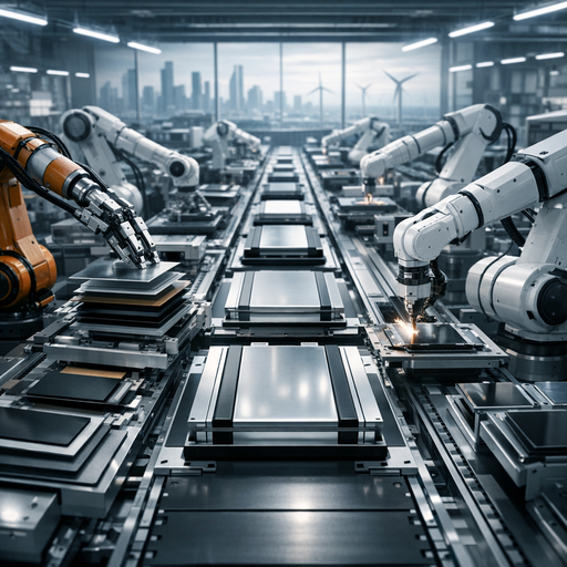 Wide-angle shot of an advanced battery manufacturing line with robotic arms assembling sleek rectangular battery cells under cool white factory lighting, overhead view highlighting layered materials and conveyor systems, faint city skyline and wind turbines visible through large windows in the background, cinematic depth of field, no text