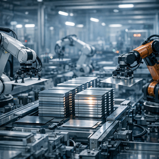 Wide cinematic shot of an advanced battery manufacturing line with robotic arms handling thin ceramic sheets and metallic foils, cool industrial lighting, soft depth of field, subtle glow on stacked battery cells, conveying precision and scale without any text or logos