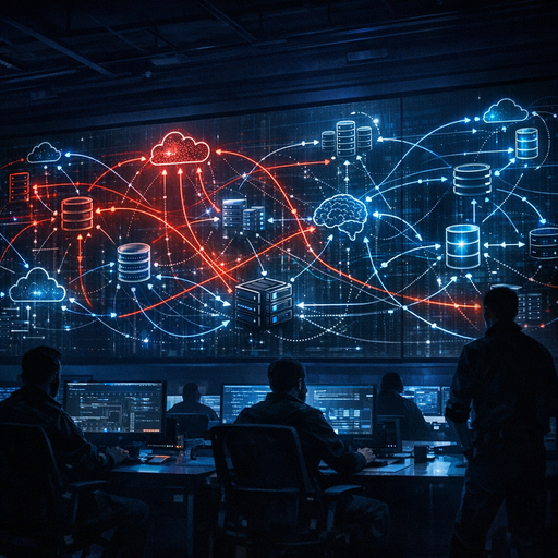 A dimly lit operations war room with large wall screens showing abstract data flows between microservices, storage clusters, and AI models, highlighted with red and blue paths; engineers’ silhouettes at consoles; cool blue lighting with sharp contrast; cinematic wide-angle composition emphasizing the complexity of interconnected systems, no text